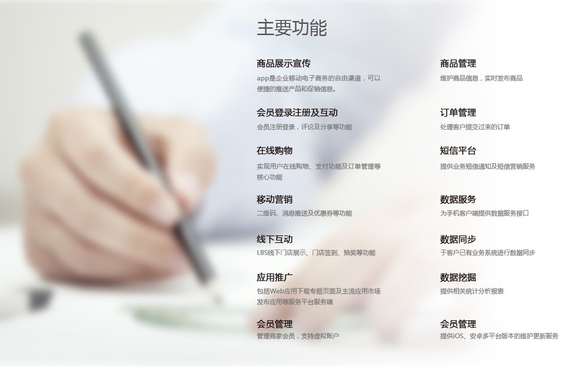 "英加诺科技"电子商务行业解决方案中规划的app应用核心产品能够帮助商家快速占有市场,通过良好的用户体验以及清晰的产品定位设计具有独特创新的产品能快速的吸引用户增加粘性,通过大数据统计等功能能够更加有效的掌握数据动向,随时调整战略,提升销售业绩如此轻松。